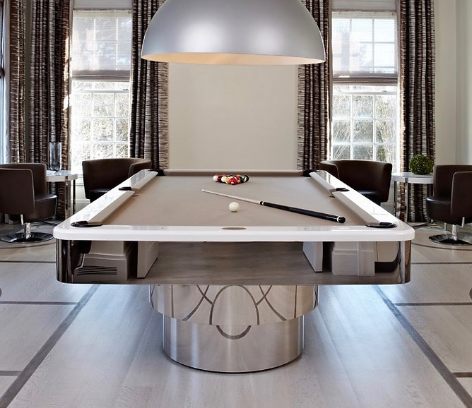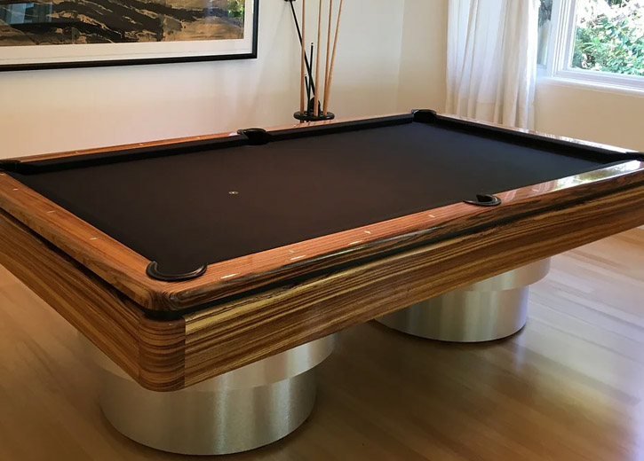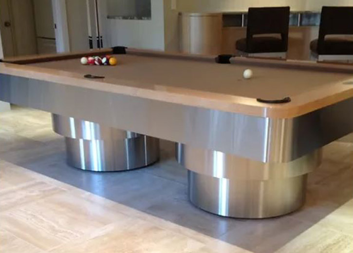 Featuring a rich wood table and a stainless steel base with large cylindrical legs, the Art Deco high-end pool table embodies geometric precision. Its striking design captures the era’s iconic glamour, making it a captivating centerpiece that elevates any luxury game room with unparalleled elegance.