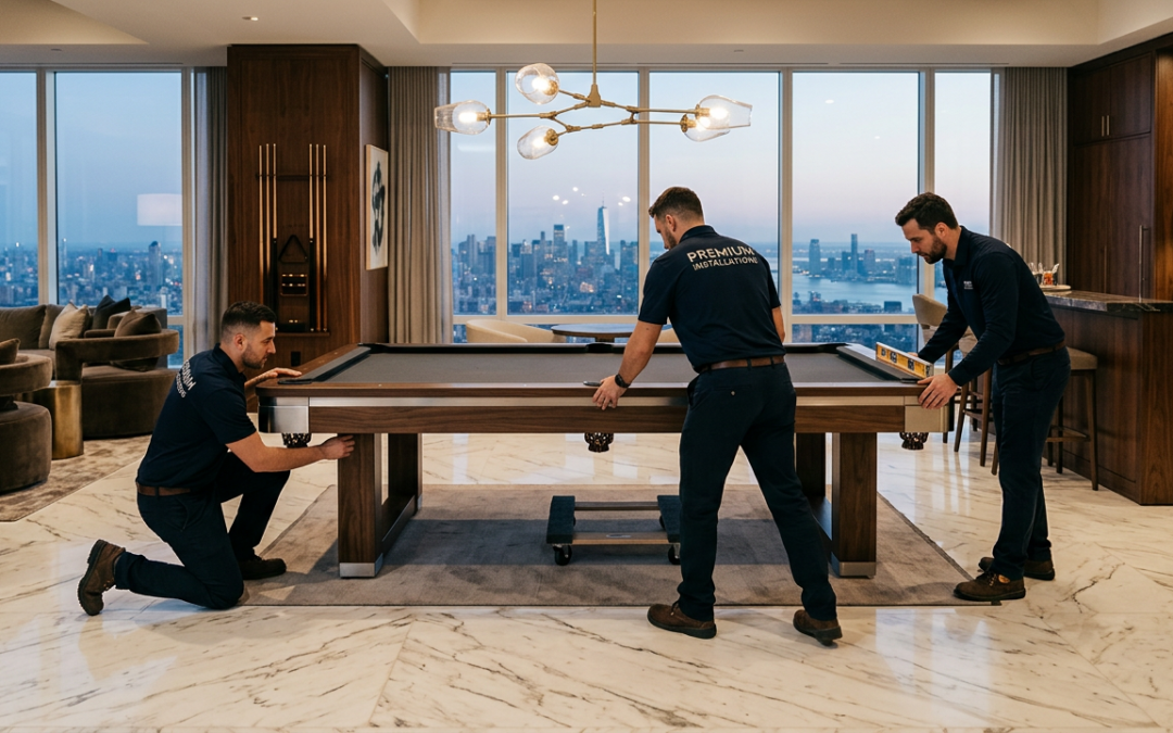 You should confirm room dimensions, clearance for cue play, access routes, flooring protection, and where the final table placement should be. A pre-installation consultation helps with all of that.